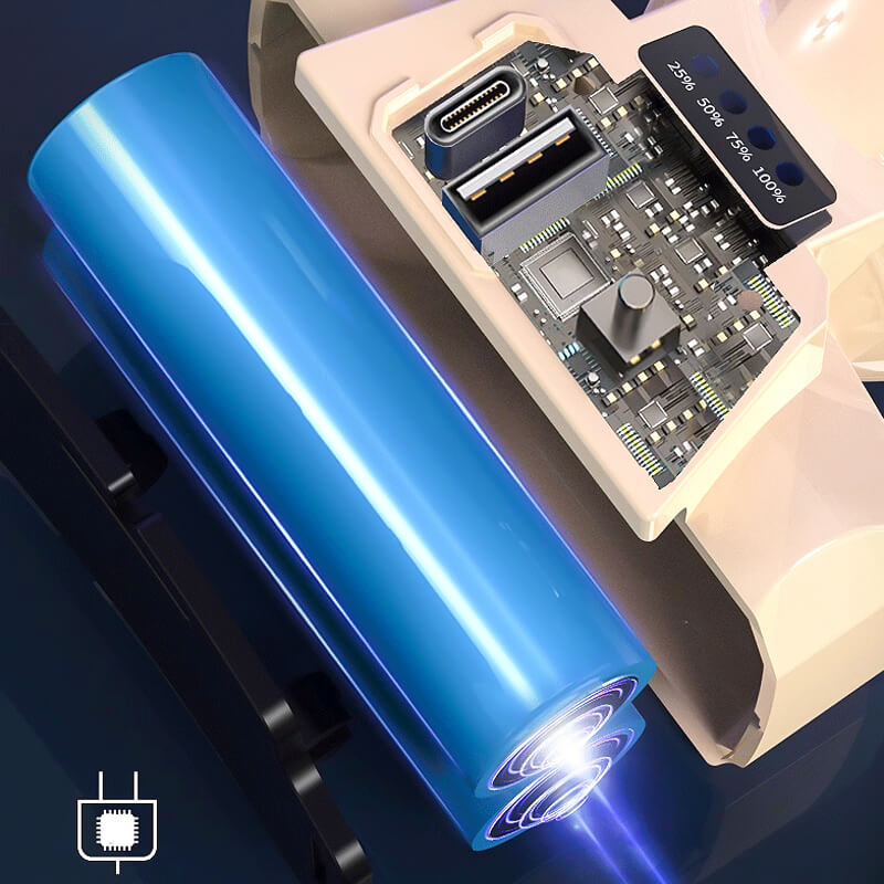 Indicador de batería- El faro frontal cuenta con un indicador de batería de cuatro rejillas con luz azul deslumbrante, que te permite verificar fácilmente el nivel de carga de la batería. Cuando la batería está completamente cargada, todas las luces indicadoras permanecen encendidas; mientras se carga, las luces indicadoras parpadearán. Cuando quede un 25% de batería restante, es importante cargarla a tiempo para evitar daños en la batería.