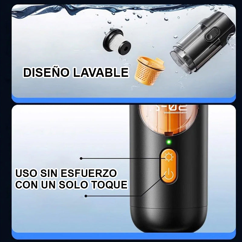 SUCCIÓN POTENTE E INALÁMBRICA: Disfruta de la comodidad de la aspiradora inalámbrica con un control de doble velocidad con un solo toque. Equipada con un motor de alta velocidad, ofrece una potente succión de 15 kPa para recoger fácilmente el polvo fino del escritorio y las migas difíciles de los asientos del coche.