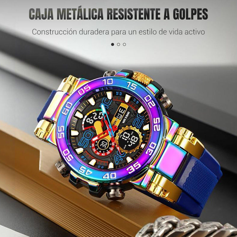 CAJA METÁLICA RESISTENTE : Fabricado con una robusta caja metálica, el reloj ofrece una resistencia superior a los golpes y una sensación de lujo. Su diseño robusto protege los componentes internos de los impactos y el desgaste diario, mientras que su acabado texturizado mejora la durabilidad y el estilo, haciéndolo práctico y elegante para el día a día.