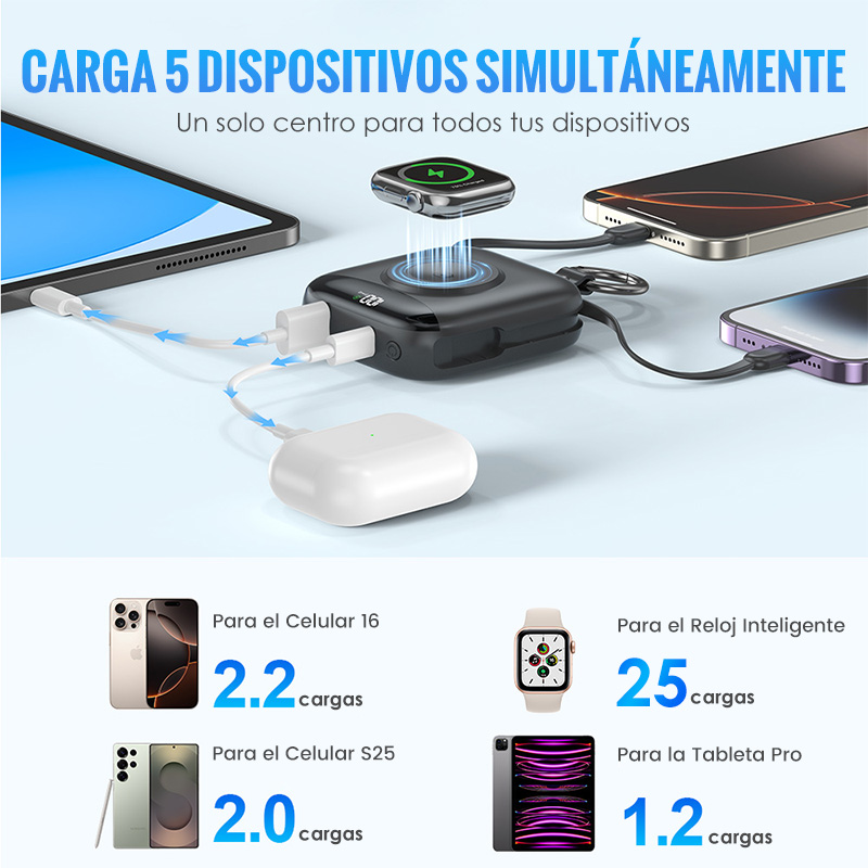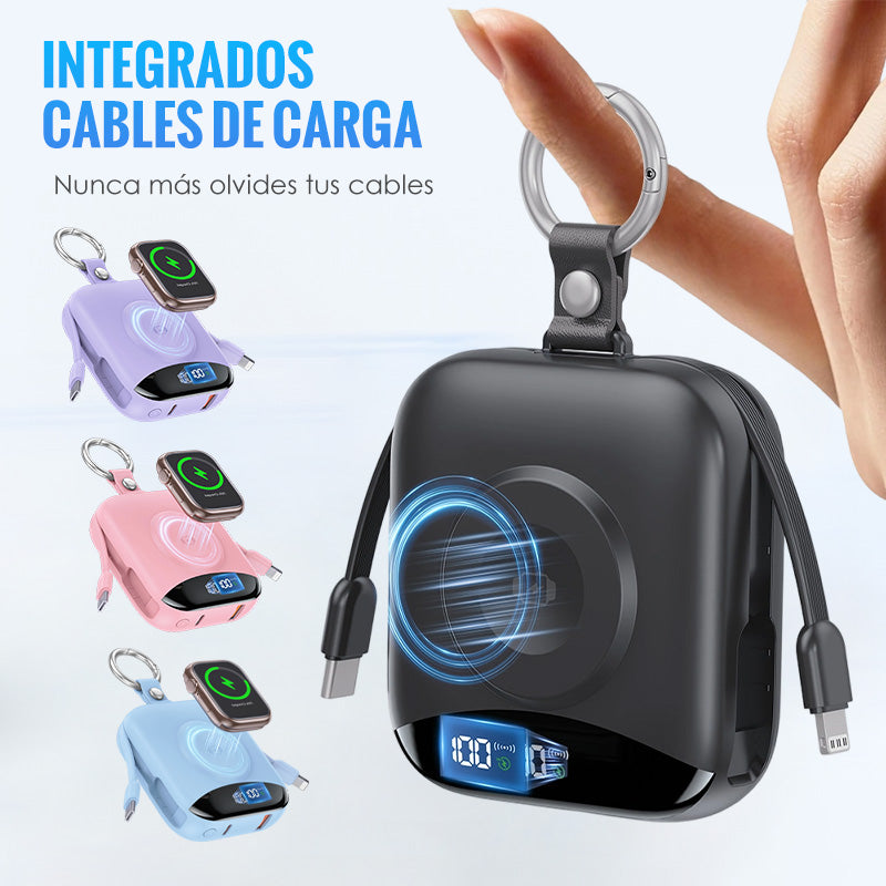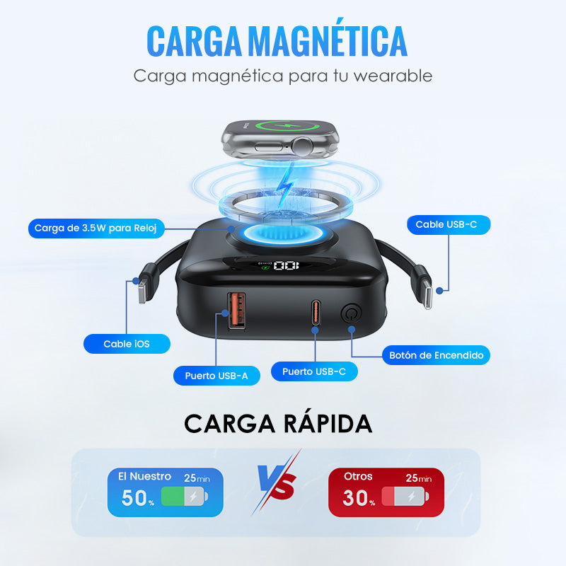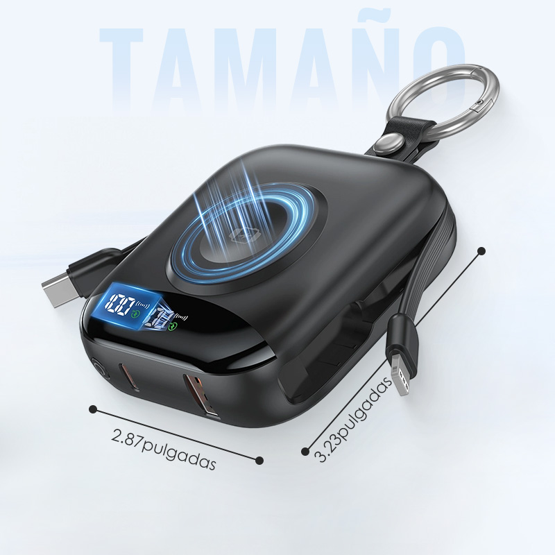 CABLES INTEGRADOS: Olvídate de los líos de cables. Esta batería externa incluye cables iOS y USB-C, lo que te permite cargar de forma inmediata y sin complicaciones una amplia gama de dispositivos justo cuando los necesitas.