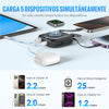 CARGA 5 DISPOSITIVOS SIMULTÁNEAMENTE: Carga toda tu colección de tecnología a la vez. Con una base magnética, dos cables integrados y dos puertos, elimina los atascos de carga y despeja tu espacio, convirtiéndolo en una solución todo en uno ideal.