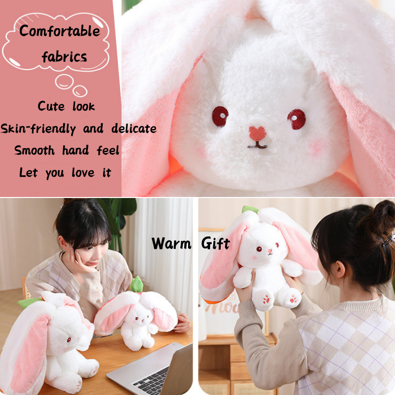 Este es un muñeco de peluche muy lindo (almohada) y vienen en fresa y zanahoria estilos. Al abrirlos, encontrarás un conejito blanco súper mono en su interior.